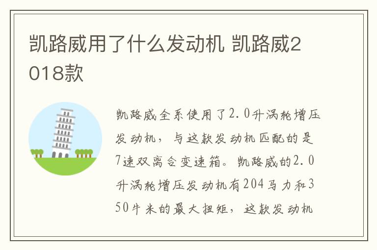 凯路威的2.0升涡轮增压发动机有204马力和350牛米的最大扭矩,这款发动机的最大功率转速为4200到6000转每分钟,最大扭矩转速为1500到4000转每分钟。这款发动机搭载了缸内直喷技术,并且使用了铝合金缸盖缸体。