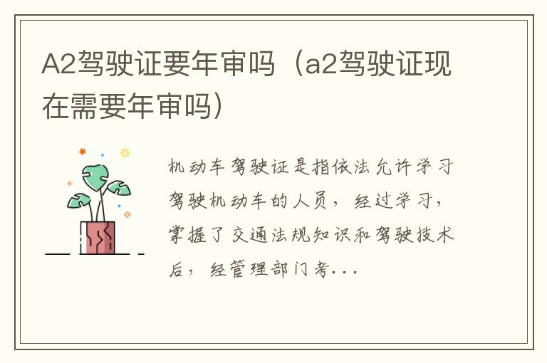 机动车驾驶证是指依法允许学习驾驶机动车的人员,经过学习,掌握了交通法规知识和驾驶技术后,经管理部门考试合格,核发许可驾驶某类机动车的法律凭证。驾驶证如何取得?A2的驾驶证需要每年都年审吗?下面小编整理了以下内容为您解答,希望对您有所帮助。