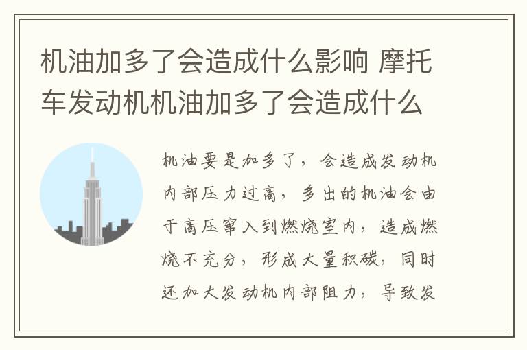 机油要是加多了,会造成发动机内部压力过高,多出的机油会由于高压窜入到燃烧室内,造成燃烧不充分,形成大量积碳,同时还加大发动机内部阻力,导致发动机加速不畅,内部各个油封出现漏油,严重时就会发展成我们最不愿意看到的现象就是“烧机油”。