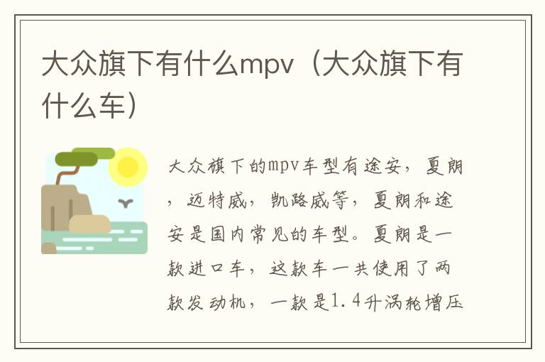 大众旗下的mpv车型有途安,夏朗,迈特威,凯路威等,夏朗和途安是国内常见的车型。