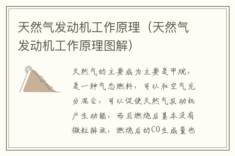 天然气的主要成为主要是甲烷,是一种气态燃料,可以和空气充分混合,可以促使天然气发动机产生动能,而且燃烧后基本没有微粒排放,燃烧后的CO生成量也很少。