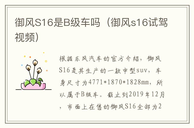 根据东风汽车的官方介绍,御风S16是其生产的一款中型suv,车身尺寸为4771*1870*1828mm,所以属于B级车。截止到2019年12月,市面上在售的御风S16全部为2017款,售价区间为11.78万元-28.98万元。