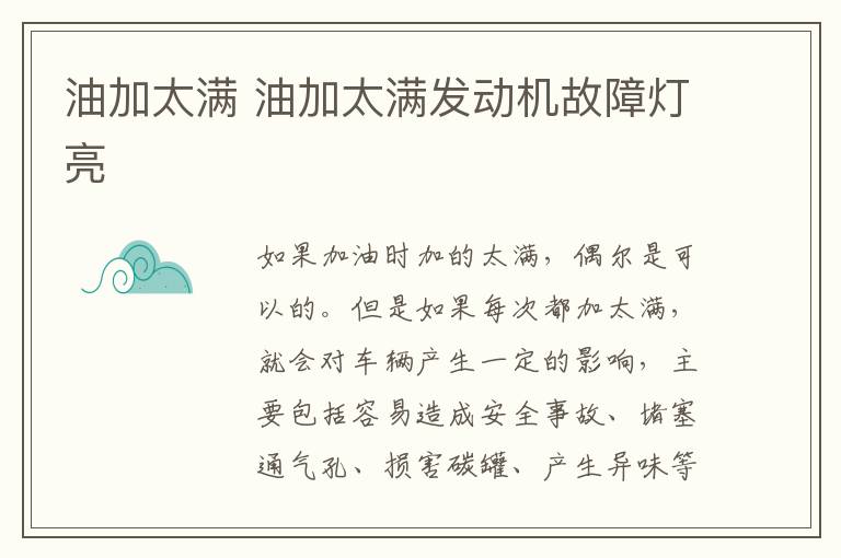 如果加油加的太满把通气孔堵住了的话,油箱内的气压就会失去平衡,从而导致汽车的供油系统出现故障。如果汽车供油系统出现故障,汽车就会产生启动困难、加速时异常抖动等问题。