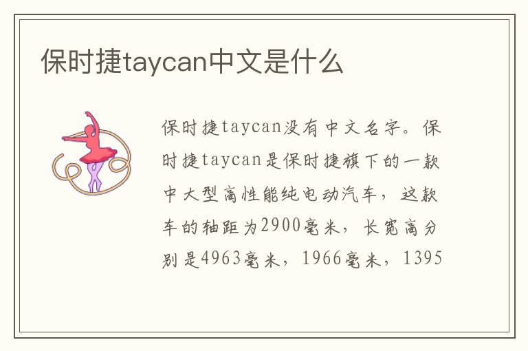保时捷taycan没有中文名字。保时捷taycan是保时捷旗下的一款中大型高性能纯电动汽车,这款车的轴距为2900毫米,长宽高分别是4963毫米,1966毫米,1395毫米。保时捷taycan有后驱版车型,也有四驱版车型。