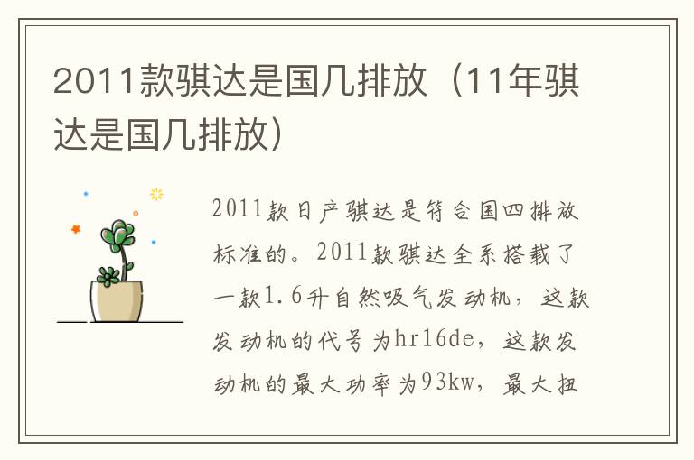 2011款骐达全系搭载了一款1.6升自然吸气发动机,这款发动机的代号为hr16de,这款发动机的最大功率为93kw,最大扭矩为154牛米,最大功率转速为5600转每分钟,最大扭矩转速为4000转每分钟。这款发动机搭载了连续可变气门正时系统,并且使用了铝合金缸盖缸体。
