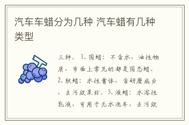三种。 1.固蜡:不含水,油性物质,市面上常见的都是固态蜡。2.软蜡:水性膏体,含研磨成分,去污效果好。3.液蜡:水溶性乳液,可用于无水洗车,去污效果较好。一般用作水蜡洗车时用。