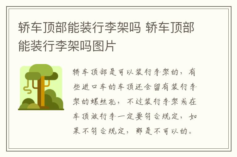 轿车顶部是可以装行李架的,有些进口车的车顶还会留有装行李架的螺丝孔,不过装行李架或在车顶放行李一定要符合规定,如果不符合规定,那是不可以的。