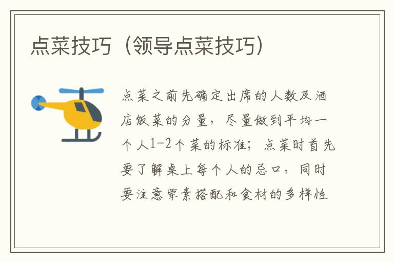 点菜之前先确定出席的人数及酒店饭菜的分量,尽量做到平均一个人1-2个菜的标准;点菜时首先要了解桌上每个人的忌口,同时要注意荤素搭配和食材的多样性,酸、辣、咸、甜等不同的口味的菜都可以点一些,尽可能照顾到每个人的口味;如果有人喝酒,要点2道左右的下酒菜。