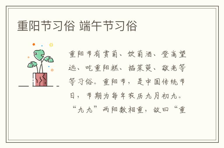 重阳节有赏菊、饮菊酒、登高望远、吃重阳糕、插茱萸、敬老等等习俗。重阳节,是中国传统节日,节期为每年农历九月初九。“九九”两阳数相重,故曰“重阳”;因日与月皆逢九,故又称为“重九”。九九归真,一元肇始,古人认为九九重阳是吉祥的日子。