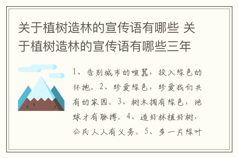 1、告别城市的喧嚣,投入绿色的怀抱。2、珍爱绿色,珍爱我们共有的家园。3、树木拥有绿色,地球才有脉搏。4、造好林植好树,公民人人有义务。5、多一片绿叶,多一份温馨。6、村上无树锅不开,四方绿化沙不来。7、植树造林,造福后辈。8、植树造林,利在当今,功在千秋。