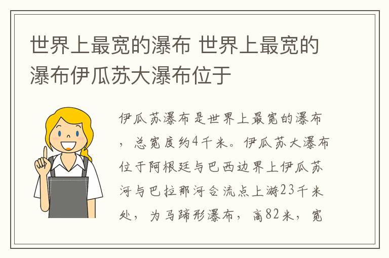 伊瓜苏瀑布是世界上最宽的瀑布,总宽度约4千米。伊瓜苏大瀑布位于阿根廷与巴西边界上伊瓜苏河与巴拉那河合流点上游23千米处,为马蹄形瀑布,高82米,宽4千米,平均落差75米。被誉为“南美第一奇观”的伊瓜苏瀑布是南美洲最大的瀑布,也是世界五大名瀑之一。