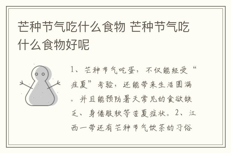 每年的6月6日,当太阳到达黄经75°时叫做芒种。芒种是二十四节气之一,也是夏季的第三个节气。那么,芒种应该吃些什么传统食物好呢?
