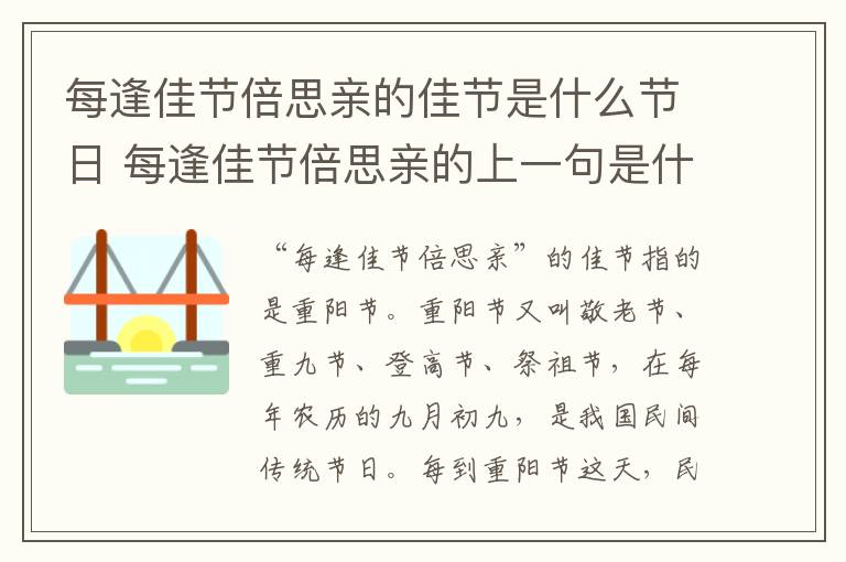“每逢佳节倍思亲”的佳节指的是重阳节。重阳节又叫敬老节、重九节、登高节、祭祖节,在每年农历的九月初九,是我国民间传统节日。每到重阳节这天,民间有登高、赏菊、饮菊花酒、插茱萸、吃重阳糕、晒秋、放纸鸢等习俗。在民俗观念中,“九”有着长久长寿的意思,寄托着人们对老人健康长寿的祝福。于是在1989年,便将农历九月九日被定为“敬老节”,倡导全社会树立尊老、敬老、爱老、助老的风尚。