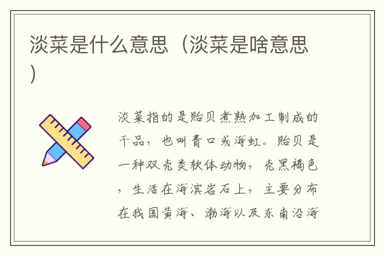 淡菜指的是贻贝煮熟加工制成的干品,也叫青口或海虹。贻贝是一种双壳类软体动物,壳黑褐色,生活在海滨岩石上,主要分布在我国黄海、渤海以及东南沿海一带。