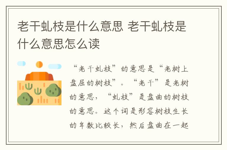 “老干虬枝”的意思是“老树上盘屈的树枝”。“老干”是老树的意思,“虬枝”是盘曲的树枝的意思。这个词是形容树枝生长的年数比较长,然后盘曲在一起的样子。造句示例:在我们老家的深山里面,有许多几人合抱都抱不住的大树,它们都老干虬枝,看过的人都觉得很是惊奇。