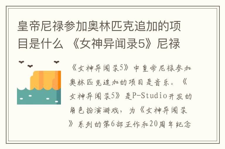 《女神异闻录5》中皇帝尼禄参加奥林匹克追加的项目是音乐。《女神异闻录5》是P-Studio开发的角色扮演游戏,为《女神异闻录》系列的第6部正作和20周年纪念作。游戏于2013年11月24日宣布制作,并于2016年9月15日在PlayStation 3、PlayStation 4平台上发售。