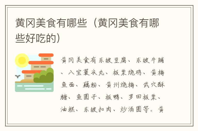 黄冈美食有东坡豆腐、东坡牛脯、八宝蓑衣丸、板栗烧鸡、黄梅鱼面、藕粉、黄州烧梅、武穴酥糖、鱼圆子、板鸭、罗田板栗、油糕、东坡扣肉、炒汤圆等。黄冈市,古称黄州,是湖北省地级市。黄冈历史文化源远流长,有2000多年的建置历史。