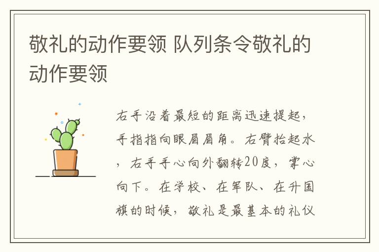 右手沿着最短的距离迅速提起,手指指向眼眉眉角。右臂抬起水,右手手心向外翻转20度,掌心向下。在学校、在军队、在升国旗的时候,敬礼是最基本的礼仪,需标准,严肃。