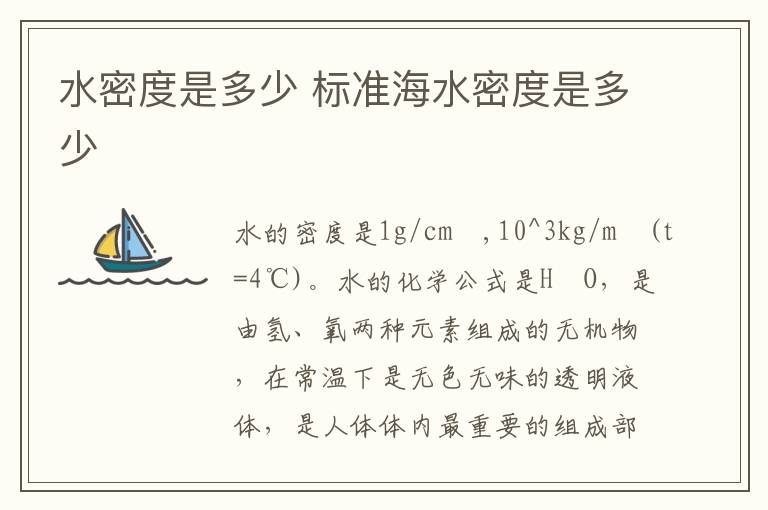 水的密度是1g/cm³,10^3kg/m³(t=4℃)。水的化学公式是H₂O,是由氢、氧两种元素组成的无机物,在常温下是无色无味的透明液体,是人体体内最重要的组成部分,是人类生命的源泉。