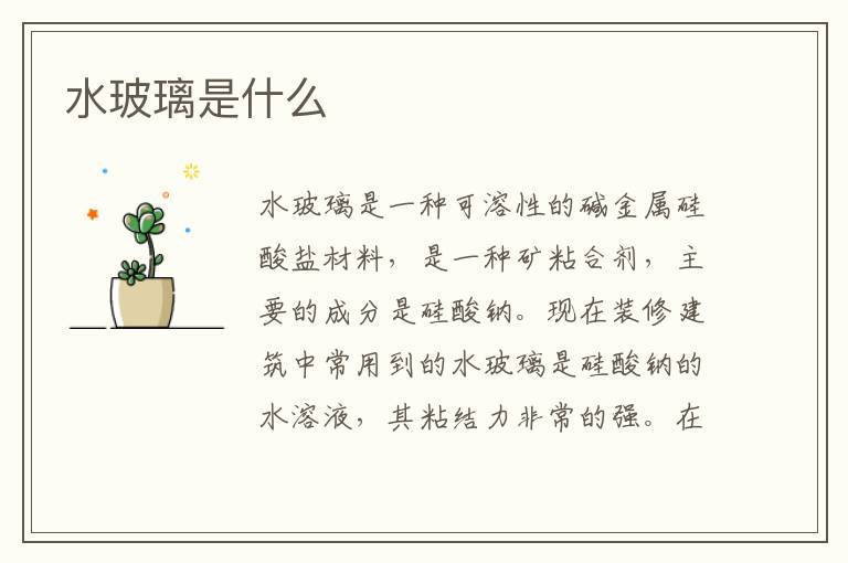 水玻璃是一种可溶性的碱金属硅酸盐材料,是一种矿粘合剂,主要的成分是硅酸钠。现在装修建筑中常用到的水玻璃是硅酸钠的水溶液,其的粘结力非常的强。在化工系统被用来制造硅胶、白炭黑、硅溶胶、硅酸钾钠等各种硅酸盐类产品,是硅化合物的基本原料。