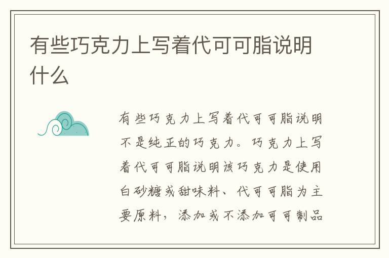 有些巧克力上写着代可可脂说明不是纯正的巧克力。巧克力上写着代可可脂说明该巧克力是使用白砂糖或甜味料、代可可脂为主要原料,添加或不添加可可制品、乳制品及食品添加剂,是具有巧克力风味及性状的食品。