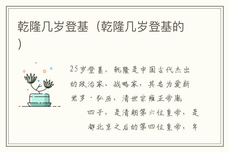 25岁登基。乾隆是中国古代杰出的政治家、战略家,其名为爱新觉罗·弘历,清世宗雍正帝胤禛第四子,是清朝第六位皇帝,是定都北京之后的第四位皇帝,年号“乾隆”,寓意“天道昌隆”。