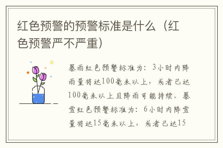 暴雨红色预警标准为:3小时内降雨量将达100毫米以上,或者已达100毫米以上且降雨可能持续。