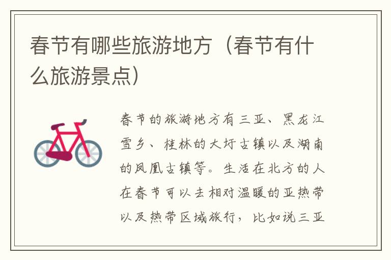 春节的旅游地方有三亚、黑龙江雪乡、桂林的大圩古镇以及湖南的凤凰古镇等。生活在北方的人在春节可以相对温暖的亚热带以及热带区域旅行,比如说三亚等区域。生活在南方的人士可以去东北欣赏雪景以及冰雕。