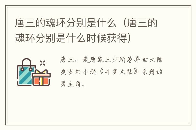 唐三的魂环分别是:第一魂环是曼陀罗蛇;第二魂环是魂兽:鬼藤;第三魂环是魂兽:人面魔蛛;第四魂环是魂兽:地穴魔蛛;第五魂环是蓝银草二次觉醒时,得到了大量蓝银草以及万年修为的蓝银王力量加持而形成的魂环;第六魂环是魂兽:柔骨魅兔;第七魂环是神赐魂环;第八魂环是魂兽:邪魔虎鲸王;第九魂环是由魂兽天青牛蟒大明献祭而来。