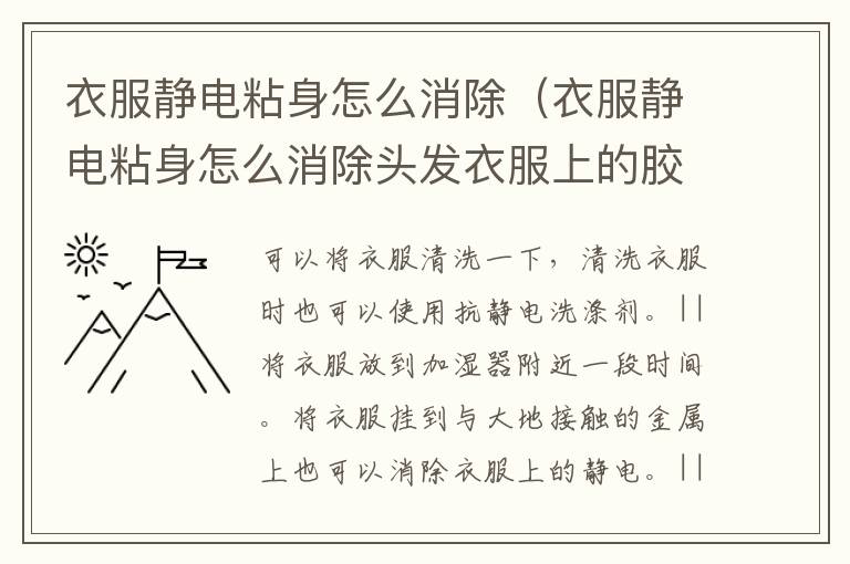 天气越干燥,静电越明显,腈纶、涤纶、人造丝、化纤制品等材质容易产生静电,如果时间比较富裕可以将衣服清洗一下,清洗衣服时也可以使用抗静电洗涤剂,在时间比较紧急的情况下,可以用一条干净的湿毛巾轻擦一遍衣服,或将衣服放到加湿器附近一段时间。