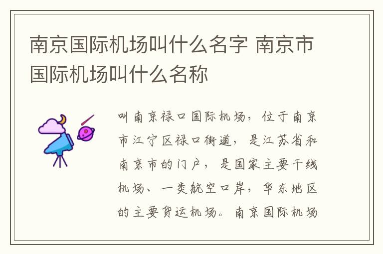 叫南京禄口国际机场,位于南京市江宁区禄口街道,是江苏省和南京市的门户,是国家主要干线机场、一类航空口岸,华东地区的主要货运机场。南京国际机场也是国家大型枢纽机场、中国航空货物中心和快件集散中心,国家区域交通枢纽。