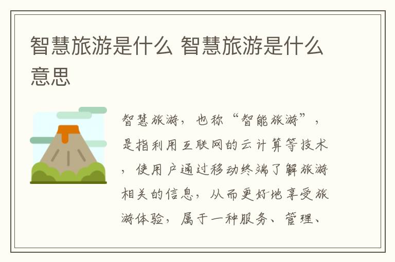 智慧旅游,也称“智能旅游”,是指利用互联网的云计算等技术,使用户通过移动终端了解旅游相关的信息,从而更好地享受旅游体验,属于一种服务、管理、营销行为。此概念最早于2010年由江苏省镇江市提出,随着移动互联网的发展,普及程度将逐渐提高。