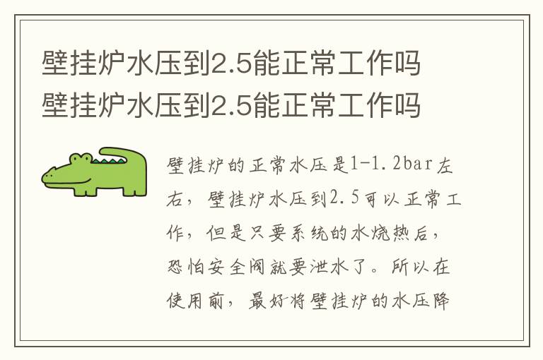 壁挂炉的正常水压是1-1.2bar左右,壁挂炉水压到2.5可以正常工作,但是只要系统的水烧热后,恐怕安全阀就要泄水了。所以在使用前,最好将壁挂炉的水压降到1.5bar以下。