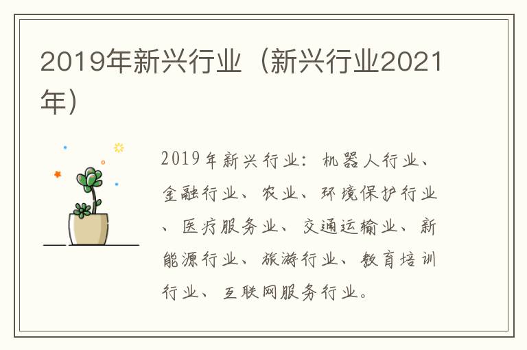 2019年新兴行业:机器人行业、金融行业、农业、环境保护行业、医疗服务业、交通运输业、新能源行业、旅游行业、教育培训行业、互联网服务行业。
