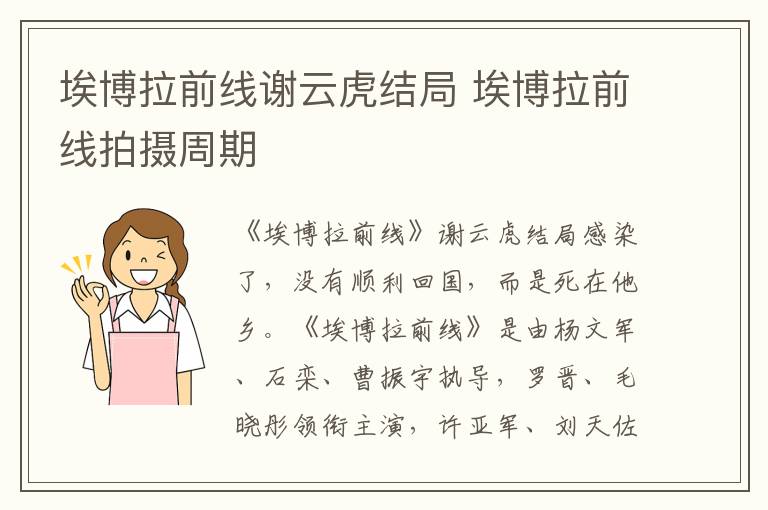 《埃博拉前线》谢云虎结局感染了,没有顺利回国,而是死在他乡。《埃博拉前线》是由杨文军、石栾、曹振宇执导,罗晋、毛晓彤领衔主演,许亚军、刘天佐、宁理、吴优、章涛主演的援非医疗行业剧。剧集共有24集,其于2021年12月8日首播。