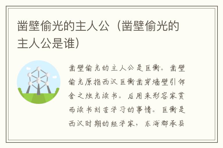凿壁偷光的主人公是匡衡。凿壁偷光原指西汉匡衡凿穿墙壁引邻舍之烛光读书。后用来形容家贫而读书刻苦学习的事情。匡衡是西汉时期的经学家,东海郡承县(今山东省枣庄市峄城区)人。匡家世代务农,但匡衡却十分好学,勤奋努力,由于家境贫寒,他不得不靠替人帮工以获取读书费用,他“凿壁借光”的故事被广为称颂。