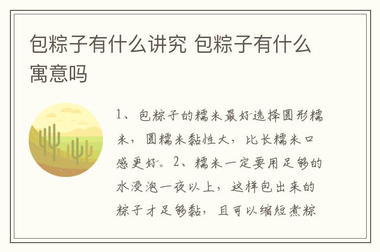 1、包粽子的糯米最好选择圆形糯米,圆糯米黏性大,比长糯米口感更好。2、糯米一定要用足够的水浸泡一夜以上,这样包出来的粽子才足够黏,且可以缩短煮粽时间。3、泡的时候,水位一定要在糯米之上,不可以使糯米暴露在空气中,糯米会粉化。4、放入粽叶的大米不宜过多,否则会撑破粽叶;系粽子的棉绳一定要系紧,避免粽子散开。
