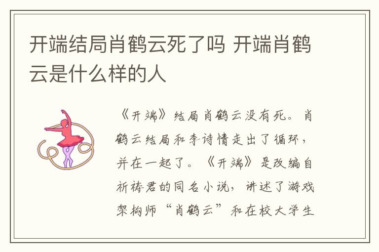 《开端》结局肖鹤云没有死。肖鹤云结局和李诗情走出了循环,并在一起了。《开端》是改编自祈祷君的同名小说,讲述了游戏架构师“肖鹤云”和在校大学生“李诗情”遭遇公交车爆炸后死而复生,在时间循环中并肩作战,努力阻止爆炸、寻找真相的故事。该剧一共15集,于2022年1月11日首播。