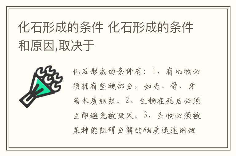 化石形成的条件有:1、有机物必须拥有坚硬部分,如壳、骨、牙或木质组织。2、生物在死后必须立即避免被毁灭。3、生物必须被某种能阻碍分解的物质迅速地埋藏起来。4、被埋藏的生物尸体还必须经历长时间的石化作用后才能形成化石。5、沉积物在固结成岩的过程中的压实作用和结晶作用。