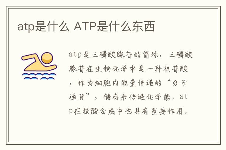 atp是三磷酸腺苷的简称,三磷酸腺苷在生物化学中是一种核苷酸,作为细胞内能量传递的“分子通货”,储存和传递化学能。atp在核酸合成中也具有重要作用。它也是RNA序列中的鸟嘌呤二核苷酸,在DNA进行转录或复制时可做为替补。
