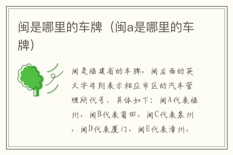 闽是福建省的车牌,闽后面的英文字母则表示相应市区的汽车管理所代号。具体如下:闽A代表福州,闽B代表莆田,闽C代表泉州,闽D代表厦门,闽E代表漳州,闽F代表龙岩,闽G代表三明,闽H代表南平, 闽J代表宁德,闽K代表平潭。