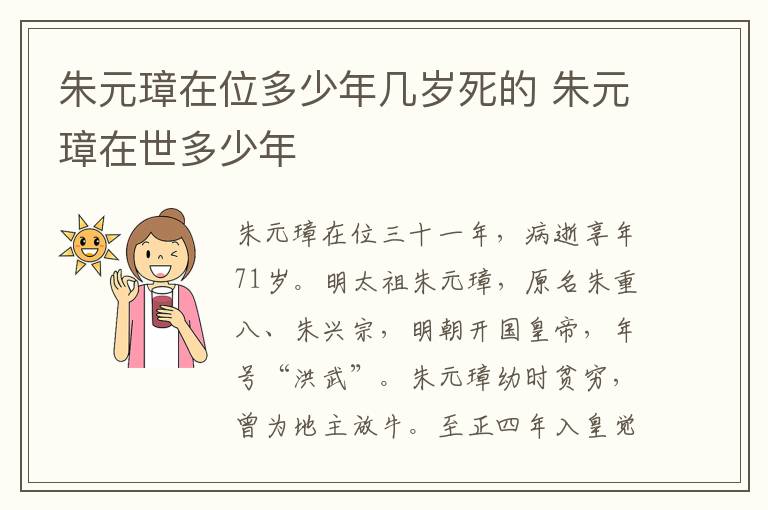 朱元璋在位三十一年,病逝享年71岁。明太祖朱元璋,原名朱重八、朱兴宗,明朝开国皇帝,年号“洪武”。朱元璋幼时贫穷,曾为地主放牛。至正四年入皇觉寺,云游四方,增长见闻。二十五岁参加郭子兴领导的红巾军,反抗元朝。至正十六年攻占集庆路,改名应天,其后陆续消灭陈友谅、张士诚等割据势力,并自称吴王。