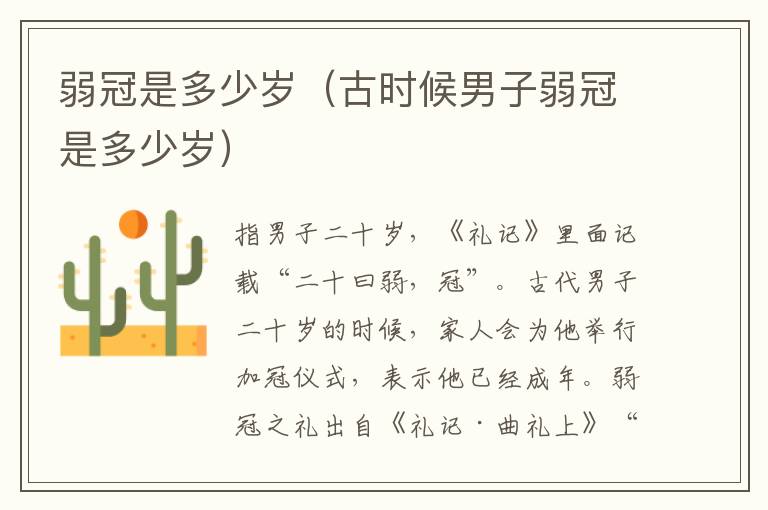 指男子二十岁,《礼记》里面记载“二十曰弱,冠”。古代男子二十岁的时候,家人会为他举行加冠仪式,表示他已经成年。弱冠之礼出自《礼记·曲礼上》“二十曰弱,冠”。
