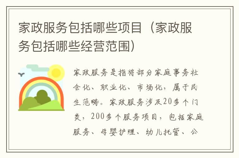 家政服务是指将部分家庭事务社会化、职业化、市场化,属于民生范畴。家政服务涉及20多个门类,200多个服务项目,包括家庭服务、母婴护理、幼儿托管、公司保洁、宠物托管等项目。