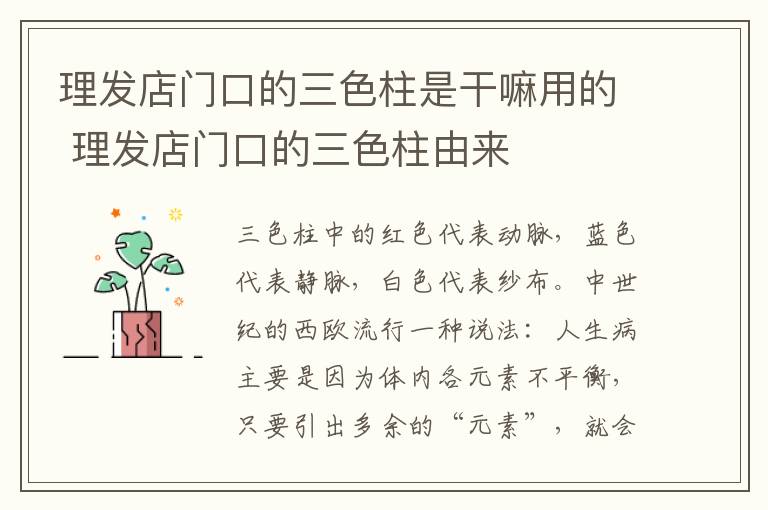 三色柱中的红色代表动脉,蓝色代表静脉,白色代表纱布。我国的理发店也沿袭这种装饰,把它作为理发店的惟一标识。