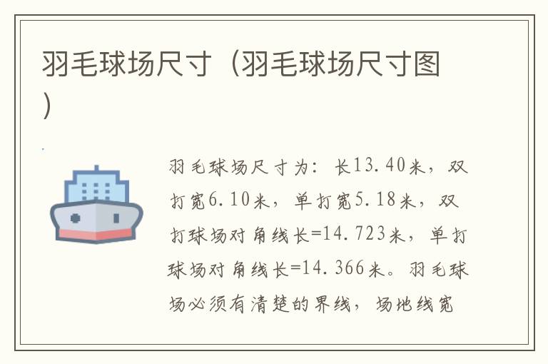 羽毛球场尺寸为:长13.40米,双打宽6.10米,单打宽5.18米,双打球场对角线长=14.723米,单打球场对角线长=14.366米。羽毛球场必须有清楚的界线,场地线宽均为40毫米,场地线的颜色最好是白色、黄色或其他容易辨别的颜色。球场上空12米以内,球场四周2米以内,不得有任何障碍物。
