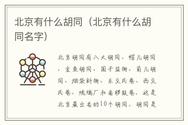 北京胡同有八大胡同、帽儿胡同、金鱼胡同、国子监街、菊儿胡同、烟袋斜街、东交民巷、西交民巷、琉璃厂和南锣鼓巷。这是北京最出名的10个胡同。胡同是北京,苏州的一大特色,不过胡同在苏州称为“巷弄”。