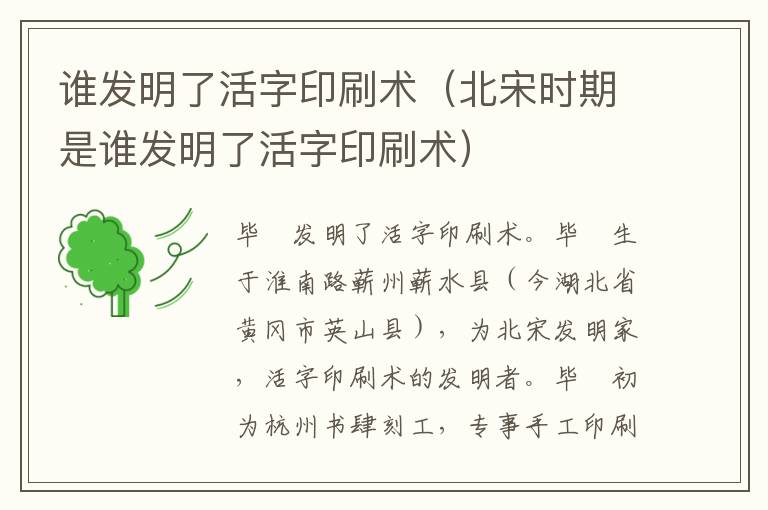 毕昇发明了活字印刷术。毕昇生于淮南路蕲州蕲水县(今湖北省黄冈市英山县),为北宋发明家,活字印刷术的发明者。毕昇初为杭州书肆刻工,专事手工印刷,在印刷实践中,毕昇认真总结了前人的经验,于北宋仁宗庆历年间发明活字印刷术,其法未及推行即卒。毕昇事迹仅见于沈括《梦溪笔谈》。