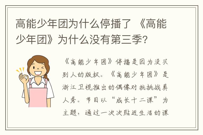 《高能少年团》停播是因为没买别人的版权。《高能少年团》是浙江卫视推出的偶像对抗挑战真人秀。节目以“成长十二课”为主题,通过一次次贴近生活的课程,让少年团在学习、历练的过程中,得到德智体美劳全方位的锻炼。第一季五位固定主持是王俊凯、刘昊然、董子健、张一山、王大陆。第二季五位固定主持是王俊凯、张一山、杨紫、王大陆、董子健。