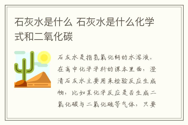 石灰水是指氢氧化钙的水溶液。在高中化学学科的课本里面,澄清石灰水主要用来检验反应生成物,比如某化学反应是否生成二氧化碳与二氧化硫等气体,只要将尾气通入盛有澄清石灰水就可以了。